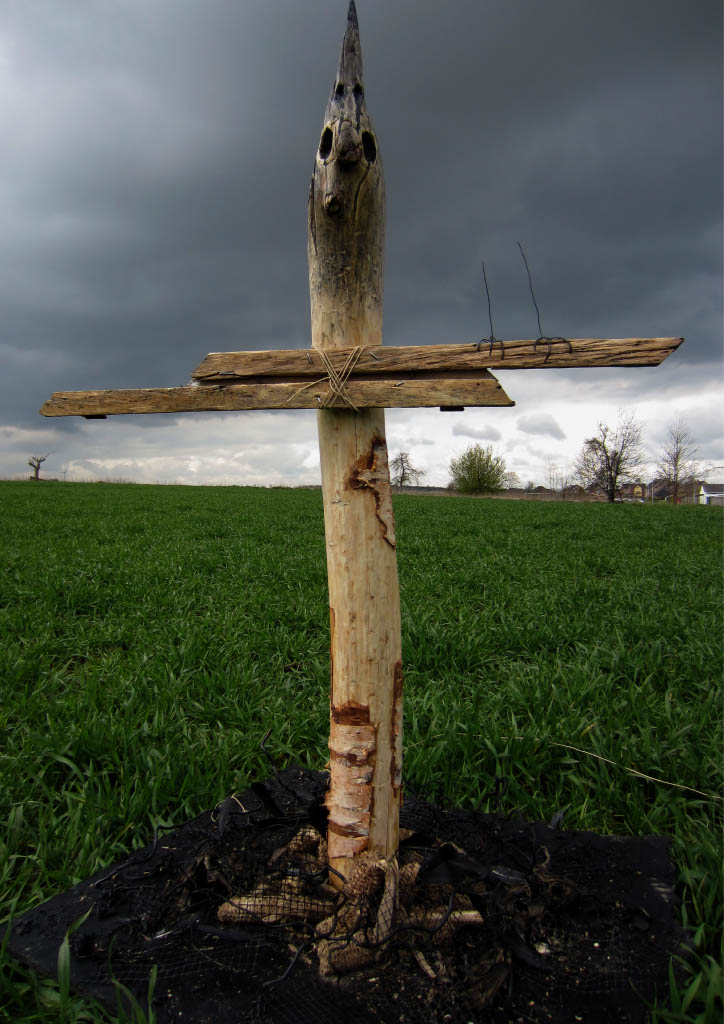 Materials: Wood, corn that’s eaten by birds, feathers, rope, wire, paint, and varnish.